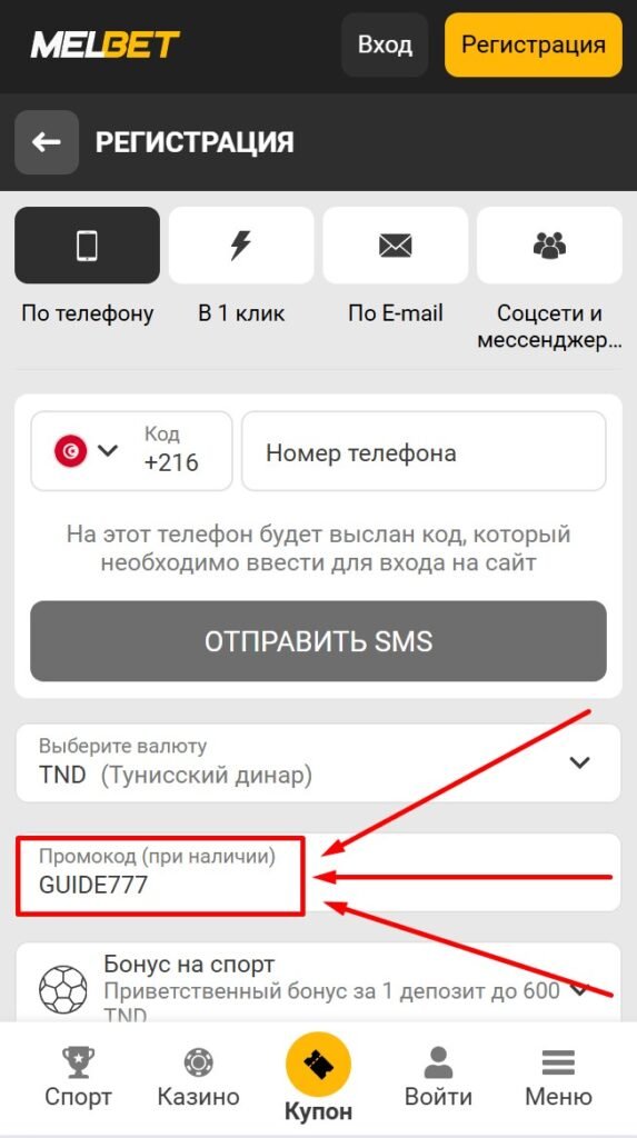 Укажите валюту и укажите промокод GUIDE777, чтобы увеличить свои MelBet бонусы при регистрации.